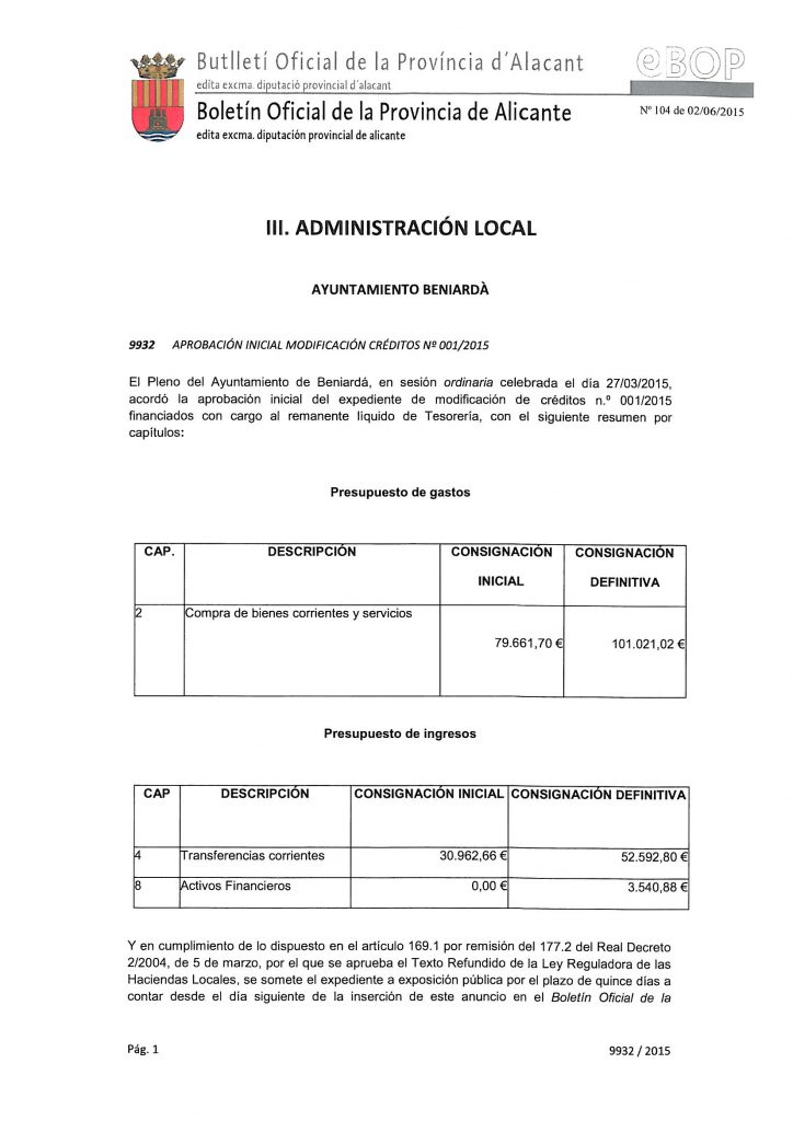 Aprobación inicial modificación créditos Nº001/2015