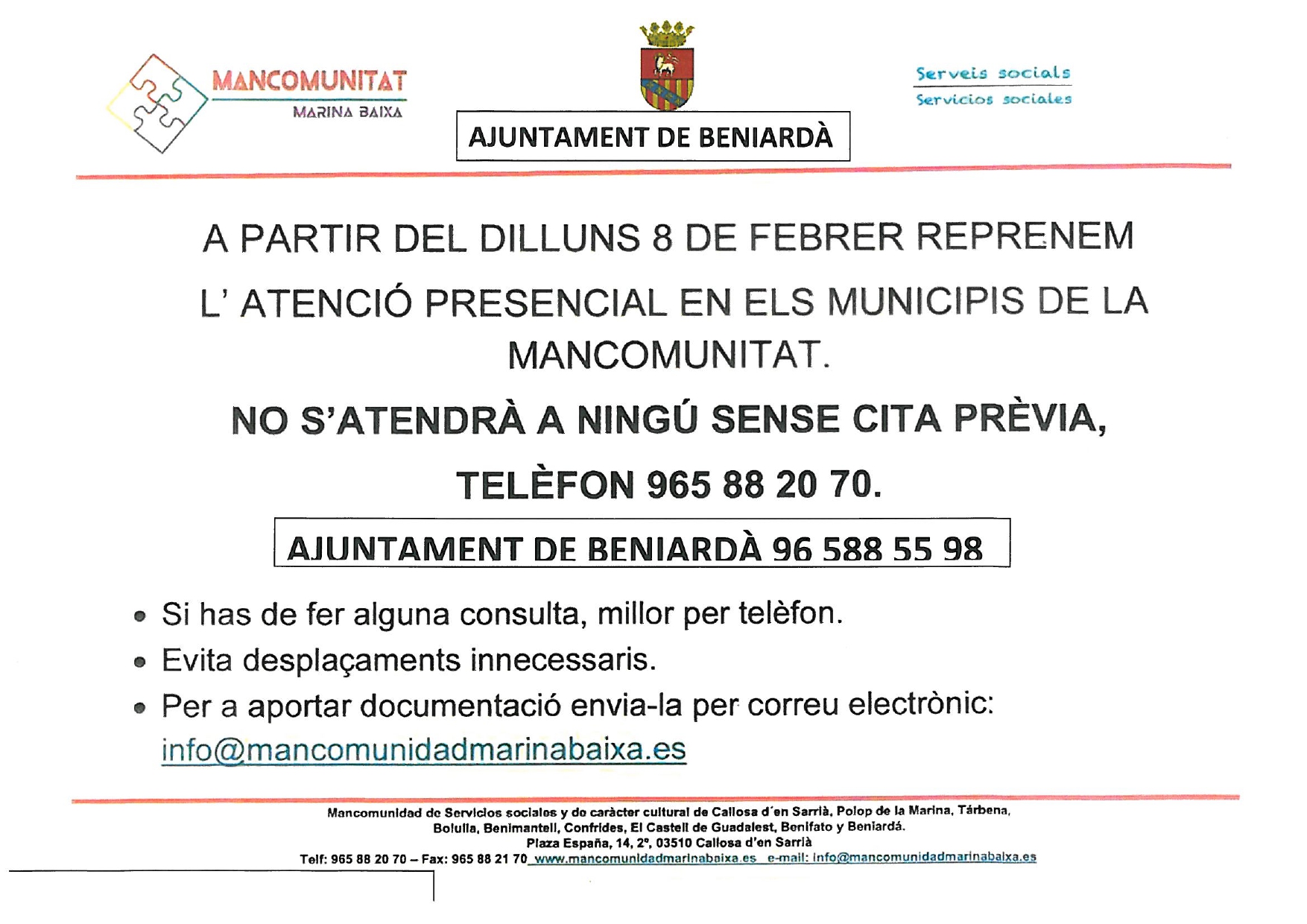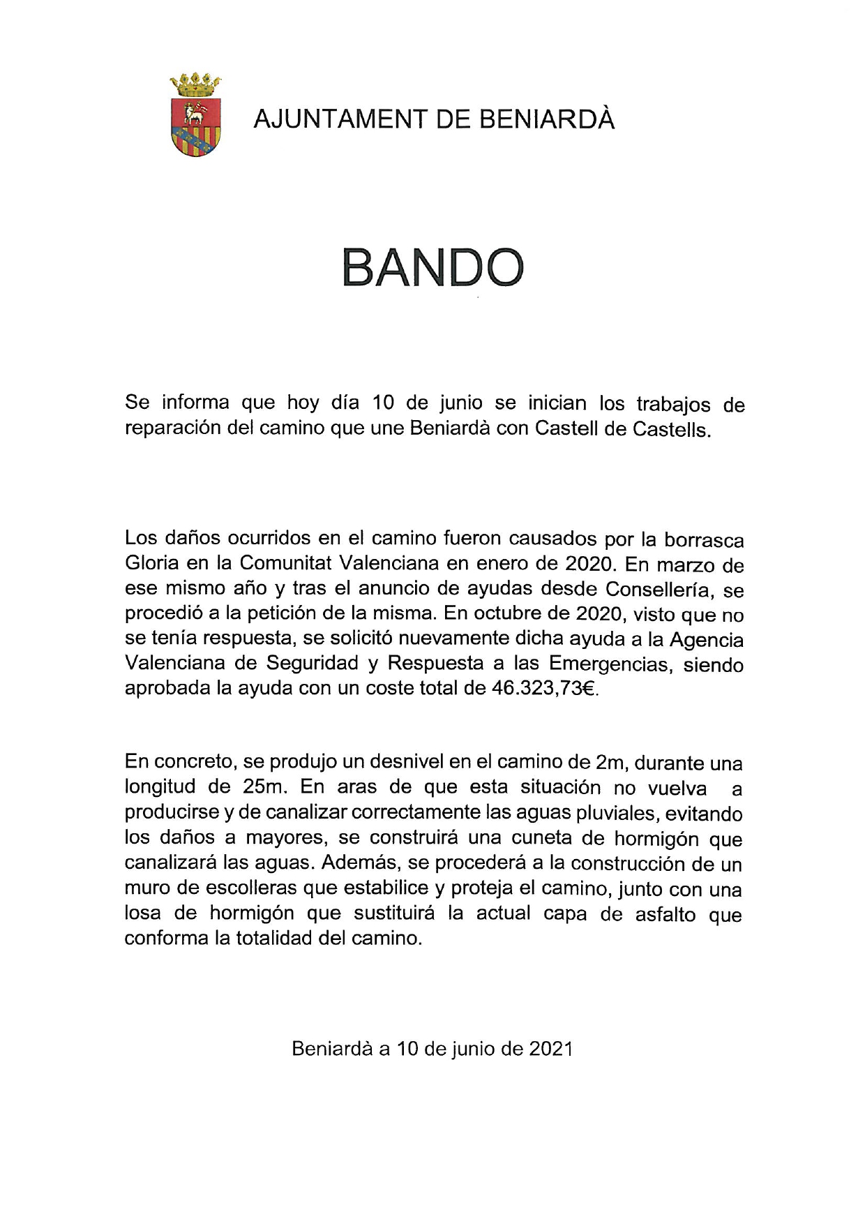 BANDO Se informa que hoy día 10 de juno se inician los trabajos de reparación del camino que une Beniardà …